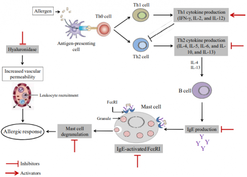 Dị ứng là phản ứng quá mẫn của hệ miễn dịch trong cơ thể chống lại những chất bình thường vô hại tồn tại trong môi trường xung quanh. Trong đó, các dưỡng bào đóng vai trò chủ đạo trong phản ứng dị ứng. Sự hoạt hóa của các dưỡng bào có thể được bắt đầu thông qua sự liên kết chéo của phân tử IgE với thụ thể FcεRI trên bề mặt tế bào. Từ đó, một loạt các đáp ứng nội bào diễn ra trong dưỡng bào, bao gồm sự kích hoạt các enzyme tyrosine kinase như Syk và Fyn, enzyme phospholipid Phospholipase Cγ (PLCγ), chất gắn kết liên kết với Grb2 (Gab2), yếu tố nhân (NF)-κB, sự sản suất các gốc oxy hóa (ROS), sự gia tăng của ion canxi (Ca2+) nội bào, sự polimer hóa các vi ống, và sau cùng là quá trình thoát bọng. Sau phản ứng, một loạt các chất trung gian được giải phóng ra như histamine, proteases, và các cytokines, gây ra các biểu hiện như ngứa, co thắt đường thở, sản sinh dịch nhầy và sự huy động các tế bào đáp ứng viêm khác. Theo cơ chế đó, nhóm nghiên cứu của chúng tôi tập trung nghiên cứu các tác nhân có khả năng chống đáp ứng dị ứng có nguồn gốc từ thiên nhiên, làm cơ sở để phát triển các sản phẩm có thể ngăn ngừa và điều trị dị ứng.